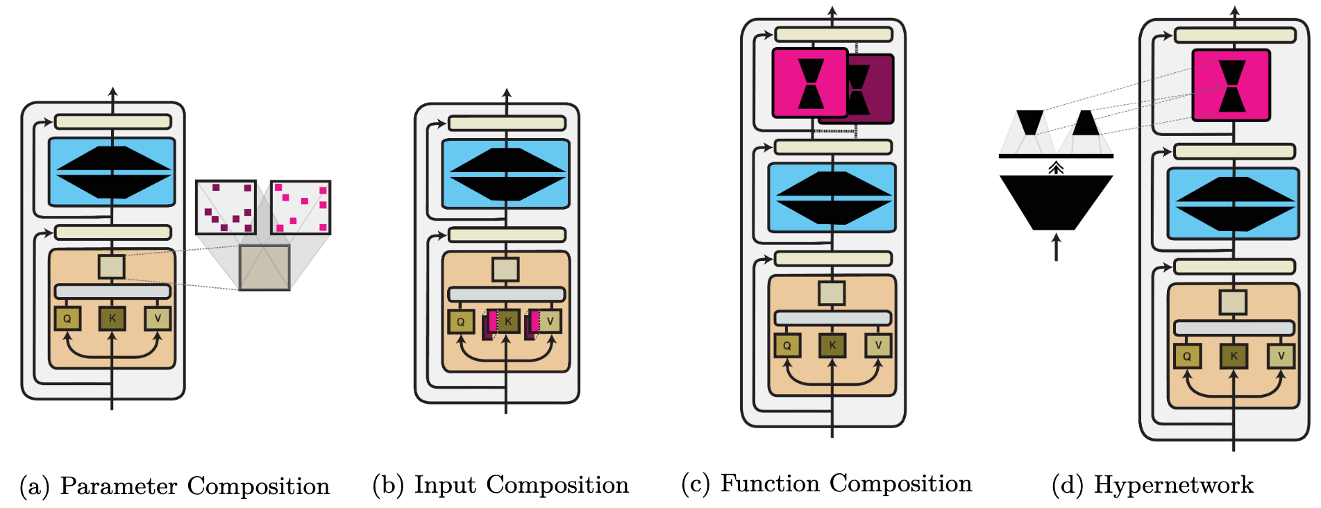 - Parameter composition. Modules modify the model on the level of individual weights: $f_i^\prime(\boldsymbol{x}) = f_{\theta_i \oplus \phi}(\boldsymbol{x})$.