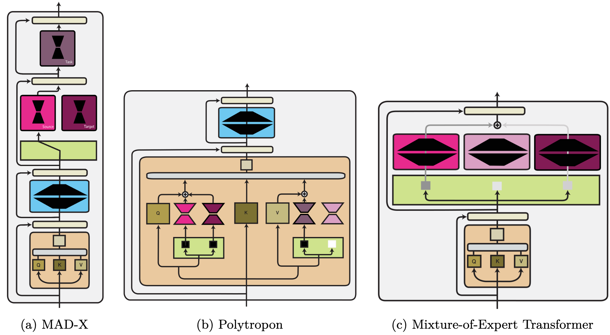 Machine translation. In MT, bilingual adapters have been used to adapt a massively multilingual NMT model to a specific source–target translation direction. Such work has been extended to more efficient monolingual adapters. Hypernetworks have been used to enable positive transfer between languages. Other approaches such as language and domain-specific subnetworks and mixture-of-experts have also been applied.