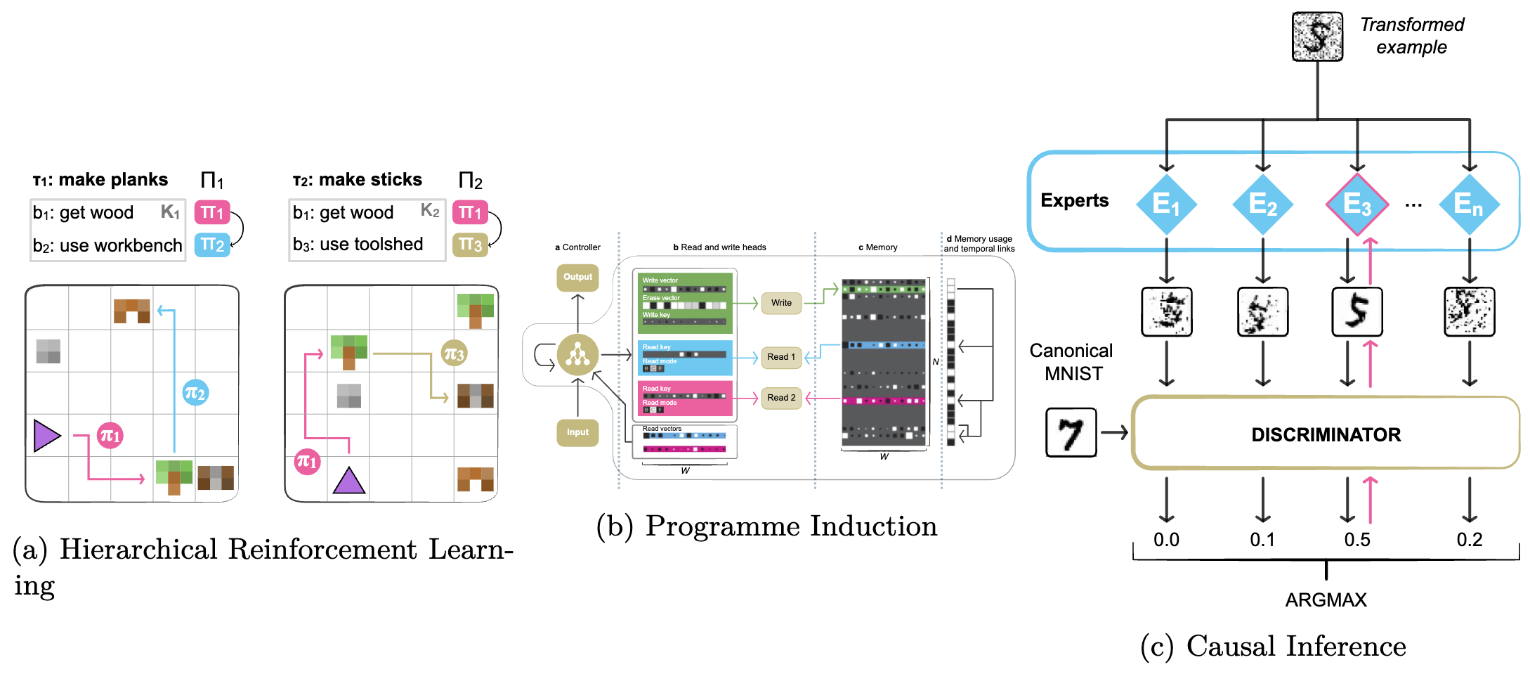 Many of the above methods are evaluated based on their ability to scale large models or enable few-shot transfer. Modularity is also crucial for other applications involving planning and systematic generalisation, including 1) hierarchical reinforcement learning; 2) neural programme induction; and 3) neural causal inference. We illustrate them below.