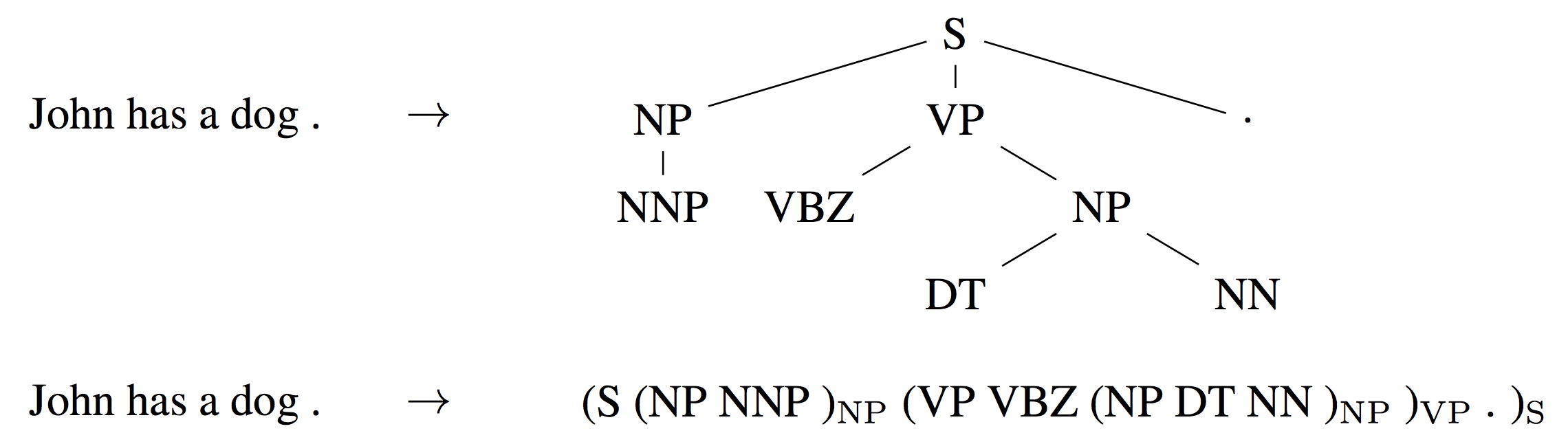 Constituency parsing seeks to extract the syntactic structure of a sentence in the form of a (linearized) constituency parse tree as can be seen below. In the past, millions of weakly labelled parses[20] have been used for training sequence-to-sequence models for this task.