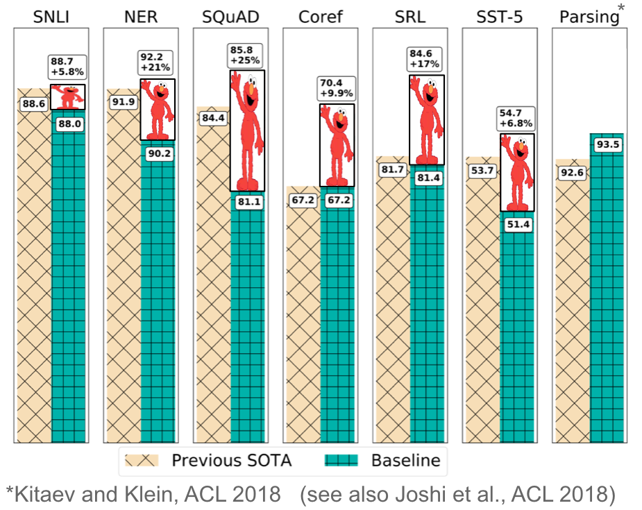 In many cases such as with ELMo in the figure below, these improvements ranged between 10-20% better than the state-of-the-art on widely studied benchmarks, all with the single core method of leveraging a pretrained language model. ELMo furthermore won the best paper award at NAACL-HLT 2018, one of the top conferences in the field. Finally, these models have been shown to be extremely sample-efficient, achieving good performance with only hundreds of examples and are even able to perform zero-shot learning.