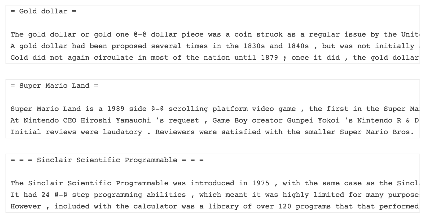 Language modeling (LM) aims to predict the next word given its previous word. Existing benchmark datasets consist of up to 1B words, but as the task is unsupervised, any number of words can be used for training. See below for examples from the popular WikiText-2 dataset consisting of Wikipedia articles.