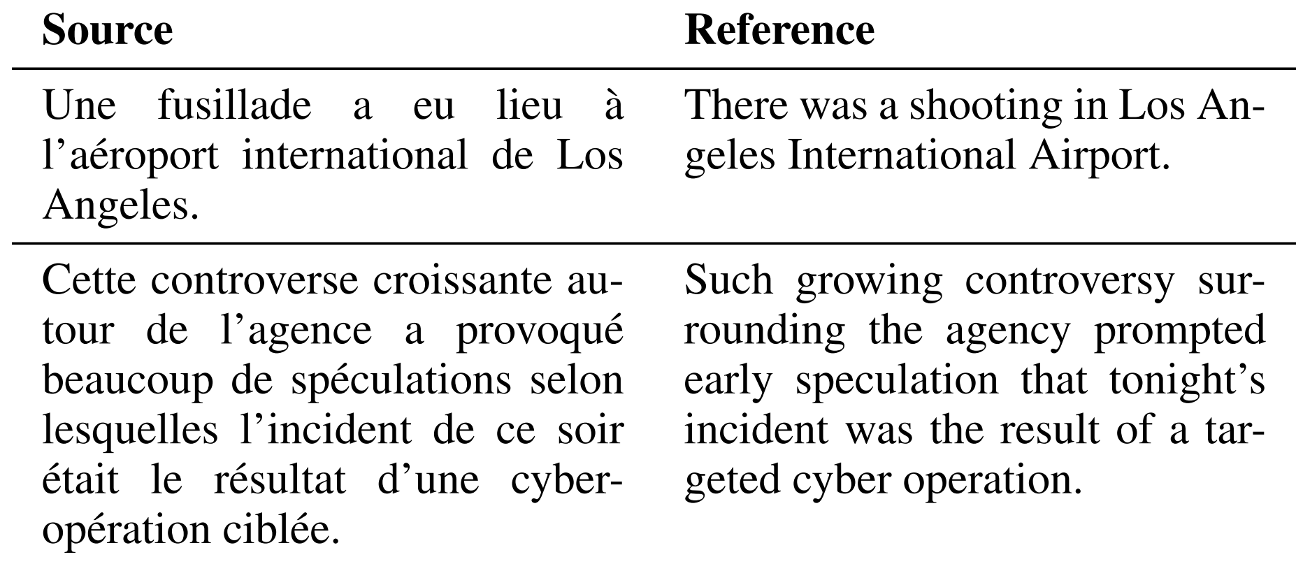 Machine translation, translating text in one language to text in another language, is one of the most studied tasks in NLP, and---over the years---has accumulated vast amounts of training data for popular language pairs, e.g. 40M English-French sentence pairs in WMT 2014. See below for two example translation pairs.