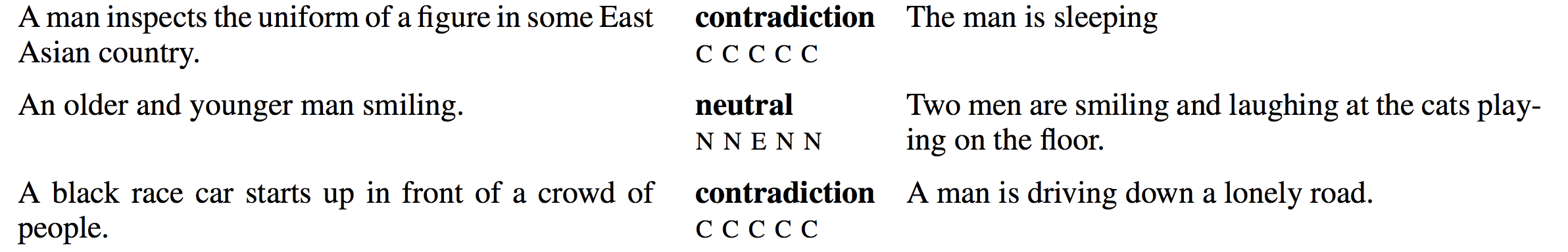 Natural language inference is the task of identifying the relation (entailment, contradiction, and neutral) that holds between a piece of text and a hypothesis. The most popular dataset for this task, the Stanford Natural Language Inference (SNLI) Corpus[19], contains 570k human-written English sentence pairs. Examples of the dataset can be seen below.