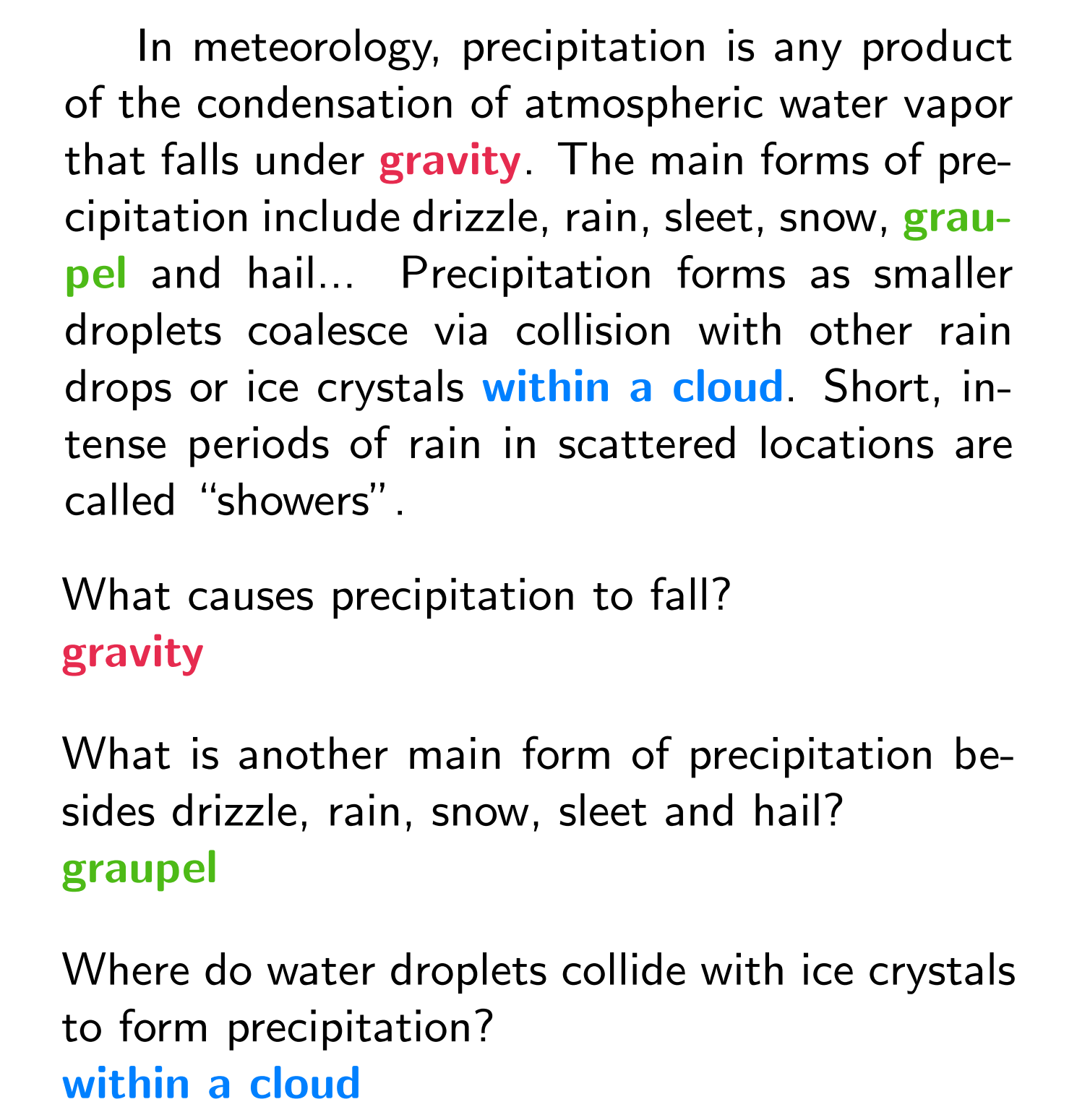 Reading comprehension is the task of answering a natural language question about a paragraph. The most popular dataset for this task is the Stanford Question Answering Dataset (SQuAD)[18], which contains more than 100,000 question-answer pairs and asks models to answer a question by highlighting a span in the paragraph as can be seen below.