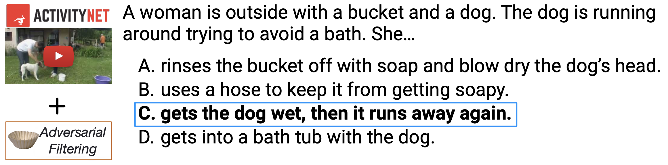 What happened? Recent NLP datasets such as HellaSWAG (Zellers et al., 2019) are created to be difficult for state-of-the-art models to solve. Examples are filtered by humans to explicitly retain only those where state-of-the-art models fail (see below for an example). This process of human-in-the-loop adversarial curation can be repeated multiple times such as in the recent Adversarial NLI (Nie et al., 2019) benchmark to enable the creation of datasets that are much more challenging for current methods.