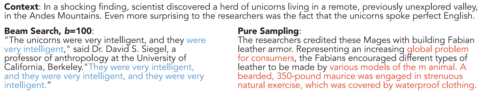 What happened? Despite ever more powerful models, natural language generation (NLG) models still frequently produce repetitions or gibberish as can be seen below. This was shown to be mainly a result of the maximum likelihood training. I was excited to see improvements that aim to ameliorate this and are orthogonal to advances in modelling. Such improvements came in the form of new sampling methods, such as nucleus sampling (Holtzman et al., 2019) and new loss functions (Welleck et al., 2019). Another surprising finding was that better search does not lead to better generations: Current models rely to some extent on an imperfect search and beam search errors. In contrast, an exact search most often returns an empty translation in the case of machine translation (Stahlberg & Byrne, 2019). This shows that advances in search and modelling must often go hand in hand.