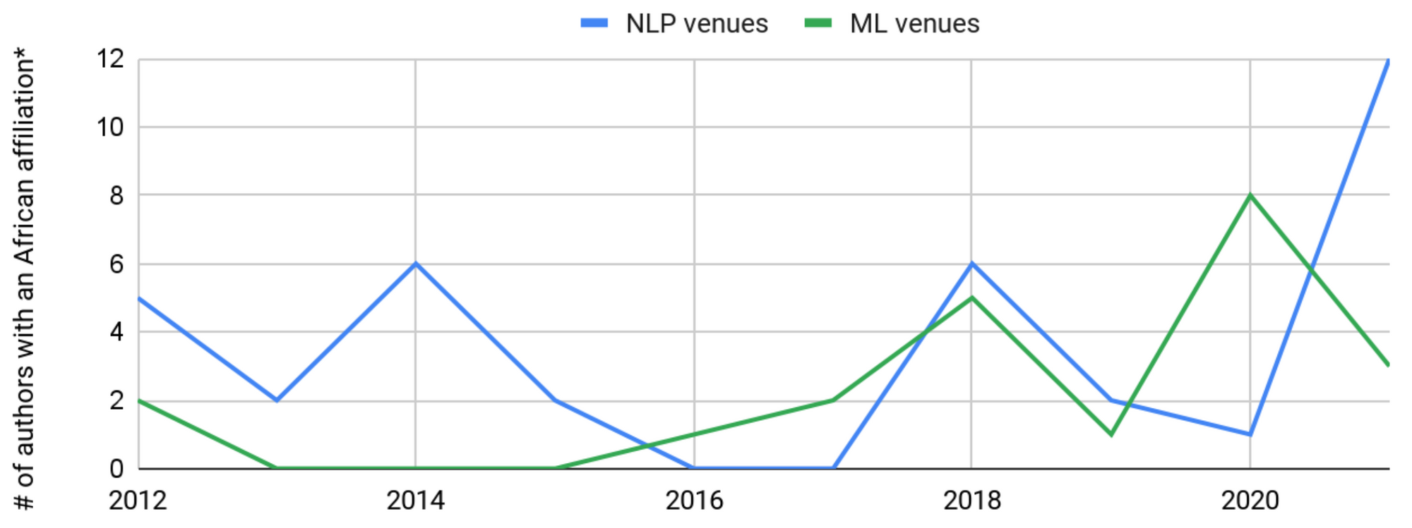 Beyond individual languages, researchers with affiliations in countries where such languages are spoken are similarly under-represented in both ML and NLP communities. For instance, while we can observe a slight upward trend in the number of authors affiliated with African universities publishing at top machine learning (ML) and NLP venues, this increase pales compared to the thousands of authors from other regions publishing in such venues every year.