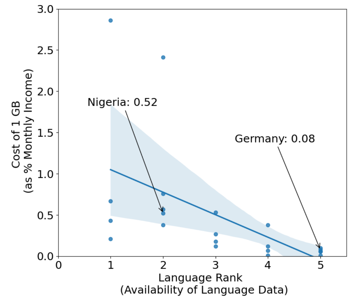 Under-represented language applications face constraints that go beyond the lack of data. Mobile data, compute, and other computational resources may often be expensive or unavailable. GPU servers, for instance, are scarce even in top universities in many countries [4:1] while the cost of mobile data is higher in countries where under-represented languages are spoken [123].