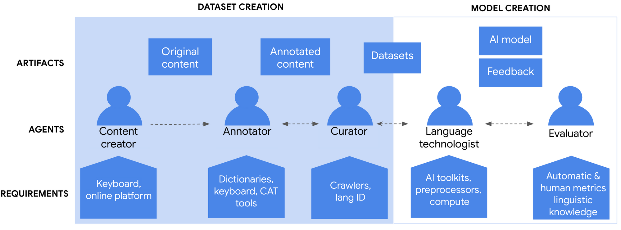 Beyond the creation of the training or evaluation data, the development of a language model requires the involvement of a large number of stakeholders, many of whom are often not explicitly acknowledged. Many of the components in this process are under-performing and often not available in many languages.
