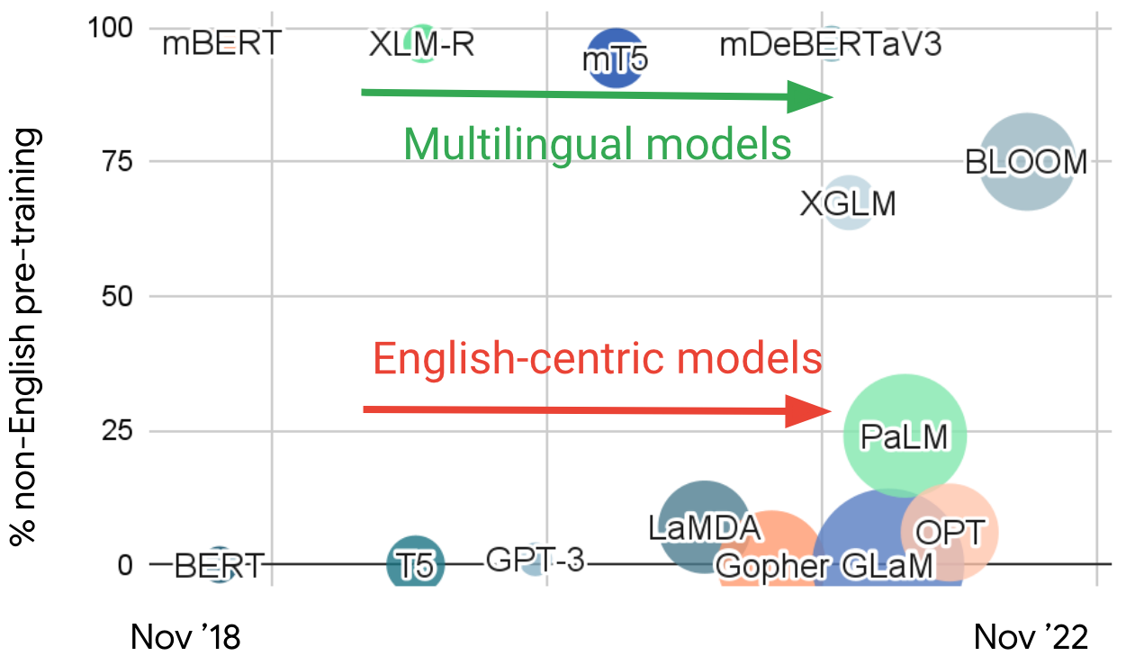 Multilingual vs English-centric models Let us now take a step back and look at recent large language models in NLP in general. We can plot recent models based on the fraction of non-English data they are pre-trained on. Based on this characterization, we can observe two distinct streams of research: 1) Multilingual models that are trained on multingual data in many languages and 2) English-centric models that are trained on mostly English data.
