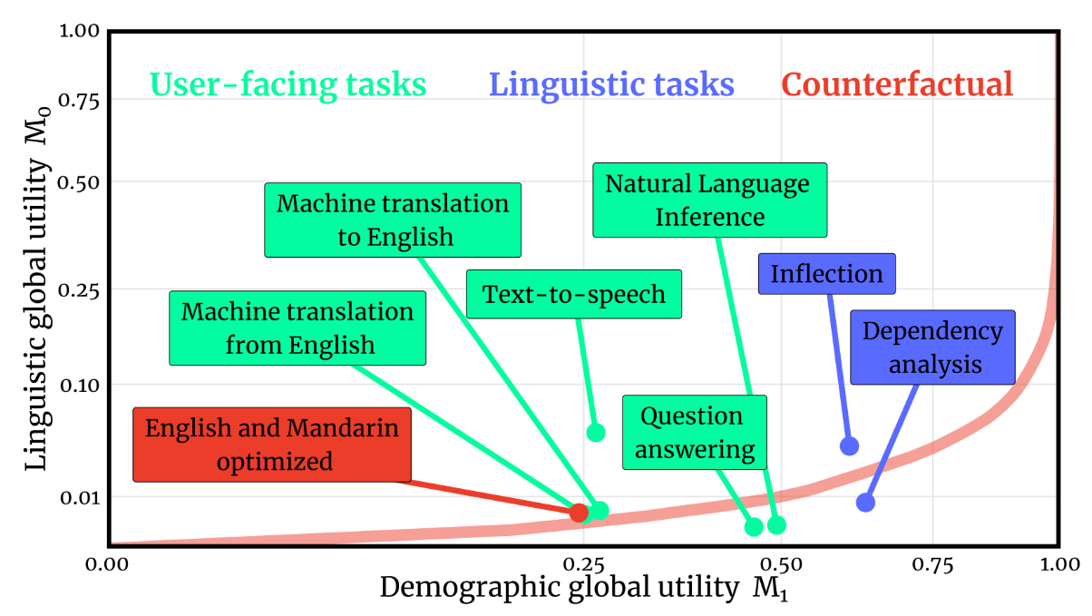 For a more accurate impression, we can look at the normalized state-of-the-art performance on different language technology tasks averaged across the world's languages either based on their speaker population (demographic utility) or equally (linguistic utility) [41].