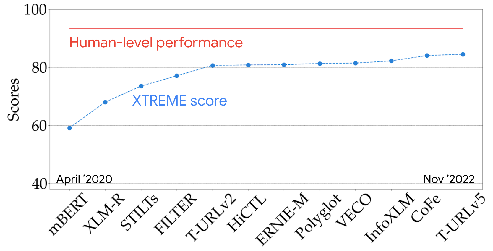 Multilingual evaluation results We can get a better picture of the state of the art by looking at the performance of recent models on a representative multilingual benchmark such as XTREME [26:1]—a multilingual counterpart to GLUE [37] and SuperGLUE [38]—which aggregates performance across 9 tasks and 40 languages. Starting with the first multilingual pre-trained models two and a half years ago, performance has improved steadily and is slowly approaching human-level performance on the benchmark.