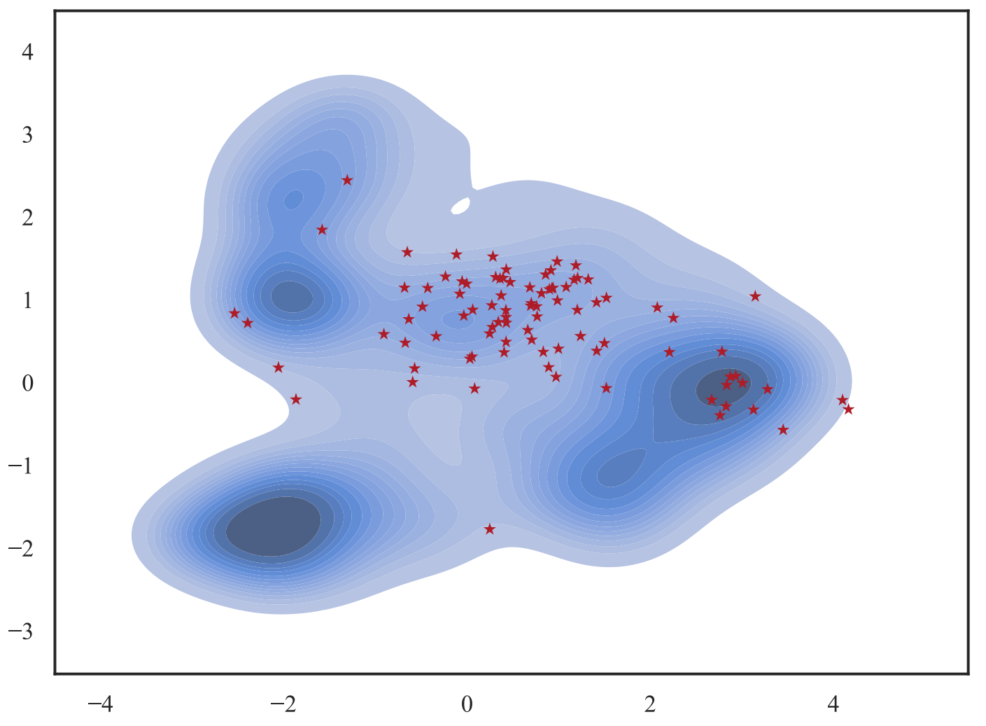 If we plot the typological features of the world's languages based on the World Atlas of Language Structures (WALS) and project them into two dimensions using PCA, we get a density plot such as the one below. Marking the languages that are present in Universal Dependencies [39:2], one of the most multilingual resources with red stars, we can observe that the languages for which data is available lie mostly in low-density regions of this plot. The distribution of languages in existing datasets is thus heavily skewed compared to the real-world distribution of languages and languages with available data are unrepresentative of most of the world's languages.