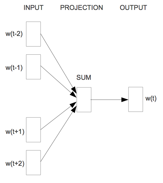 While a language model is only able to look at the past words for its predictions, as it is evaluated on its ability to predict each next word in the corpus, a model that just aims to generate accurate word embeddings does not suffer from this restriction. Mikolov et al. thus use both the \(n\) words before and after the target word \( w_t \) to predict it as depicted in Figure 4. They call this continuous bag-of-words (CBOW), as it uses continuous representations whose order is of no importance.