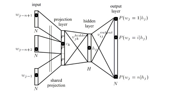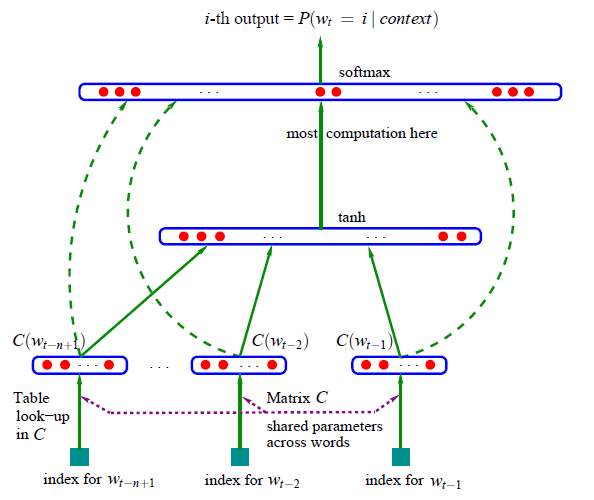 Bengio et al. are one of the first to introduce what we now refer to as a word embedding, a real-valued word feature vector in \(\mathbb{R}\). Their architecture forms very much the prototype upon which current approaches have gradually improved. The general building blocks of their model, however, are still found in all current neural language and word embedding models. These are:
