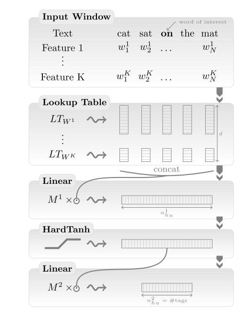 Collobert, R., Weston, J., Bottou, L., Karlen, M., Kavukcuoglu, K., & Kuksa, P. (2011). Natural Language Processing (almost) from Scratch. Journal of Machine Learning Research, 12 (Aug), 2493–2537. Retrieved from http://arxiv.org/abs/1103.0398 ↩︎